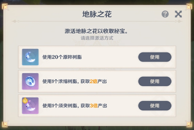 4、刷20體的地脈/秘境可以選擇消耗須臾樹脂,一次性獲得3倍獎勵(以后重復(fù)刷本就不用捏完樹脂回去合成濃縮后再回來刷了)