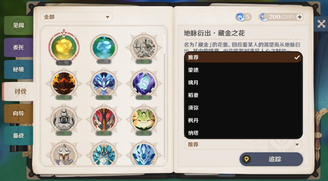 5、討伐新增地脈花,選擇地區(qū)后可一鍵追蹤,同時新增查看目標(biāo)首領(lǐng)特性/抗性/弱點的功能