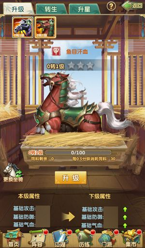 坐騎的升級(jí)是掛機(jī)式的玩法,只要飼料充足,養(yǎng)在馬廄中的坐騎就會(huì)隨時(shí)間得到經(jīng)驗(yàn)。前面也提到了,當(dāng)升級(jí)到一定級(jí)數(shù),坐騎必須轉(zhuǎn)生才可繼續(xù)獲得經(jīng)驗(yàn)升級(jí)。而坐騎的轉(zhuǎn)生,需要消耗同等級(jí)的坐騎作為材料。因此,當(dāng)陣上的坐騎已經(jīng)滿級(jí),需要轉(zhuǎn)生的時(shí)候,掌門可以將馬廄的位置用于升級(jí)材料馬,這樣才能最大化的提升坐騎的等級(jí)。