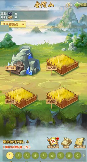 配合蓄馬場(chǎng)的出現(xiàn),金陵山的相關(guān)玩法也開啟了。游戲中,掌門可在金陵山中通過(guò)占領(lǐng)資源點(diǎn)獲取資源,而資源點(diǎn)分為鐵礦場(chǎng)和草料場(chǎng)兩種,鐵礦場(chǎng)生產(chǎn)鑌鐵,草料場(chǎng)生產(chǎn)草料。需要注意的是,每個(gè)弟子最多只能占領(lǐng)兩個(gè)資源點(diǎn),搶奪和防守都會(huì)以隊(duì)伍為單位進(jìn)行,掌門需要合理分配隊(duì)伍,一個(gè)隊(duì)伍最多放置3名弟子。