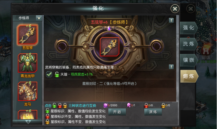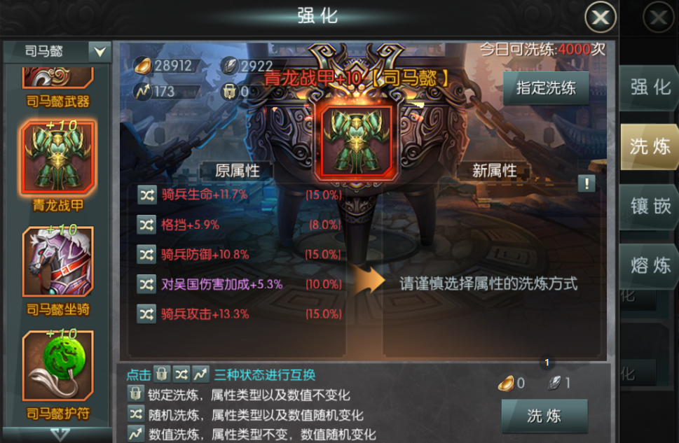 2.?洗練屬性中有三個(gè)屬性必須為兵種的加成,這三個(gè)就是對(duì)應(yīng)你的武將所帶的兵種,分別有(騎兵,弓兵,步兵)一定要洗練到你相對(duì)應(yīng)的兵種,若你的武將帶的是騎兵,就一定要把4件裝備洗練到騎兵的加成,給武將最大值的(生命,防御,攻擊加成)。