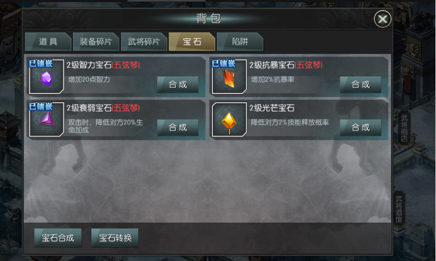 ??寶石:優(yōu)先(技能釋放屬性寶石,攻擊寶石,元素寶石,暴擊寶石)輸出武將的技能一定要每個(gè)回合都能釋放。