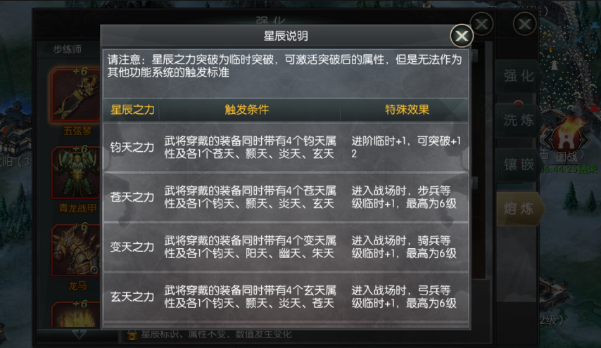 當(dāng)武將裝備上觸發(fā)條件的擁有星辰之力的裝備套裝時(shí),就可以獲得特殊效果,不同的觸發(fā)條件擁有不同的特殊效果。