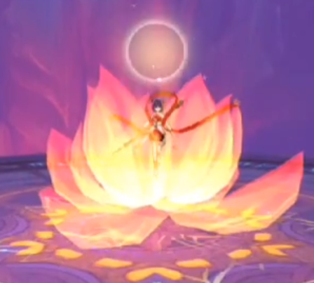 注:高傷AOE傷害,自身旋轉(zhuǎn)釋放一束連天火圈,狀態(tài)結(jié)束會有個插地結(jié)尾技能,此時,所有周圍玩家會被擊退。可在火圈即將結(jié)束時拉開距離。火圈釋放途中,可尋找攜帶蓮花之人,站在一起,降低所受傷害。