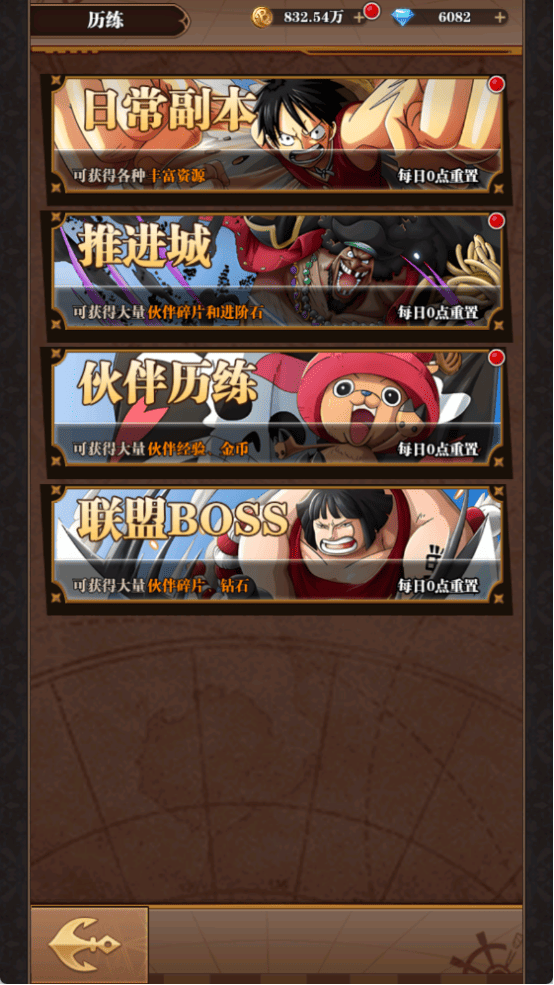 本游戲有非常多有意思的副本玩法,在推進(jìn)城中首通層數(shù)可獲得大量伙伴碎片和進(jìn)階石,掃蕩可獲得大量貝里和突破卡。伙伴歷練中可以可獲得大量伙伴經(jīng)驗(yàn)、金幣。強(qiáng)者降臨:挑戰(zhàn)boss可以獲得鉆石、進(jìn)階石和貝利。更有多種玩法,獲取豐富資源。還有更多副本玩法等你來發(fā)現(xiàn)!
