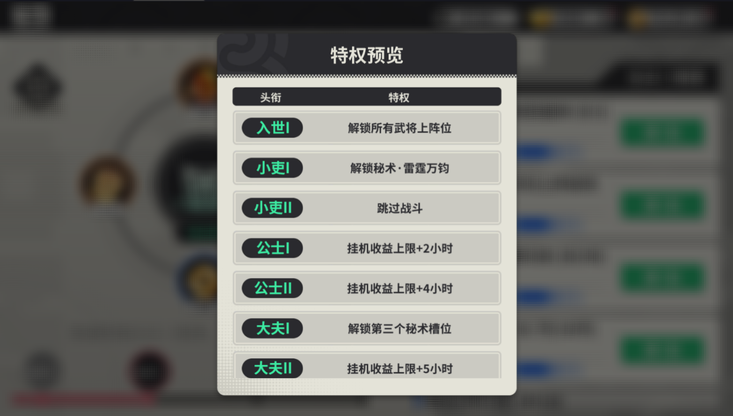玩家可以消耗道具提升自身的爵位,可以提升自身屬性,對抗爵位比自己低的玩家,還有特殊的壓制屬性