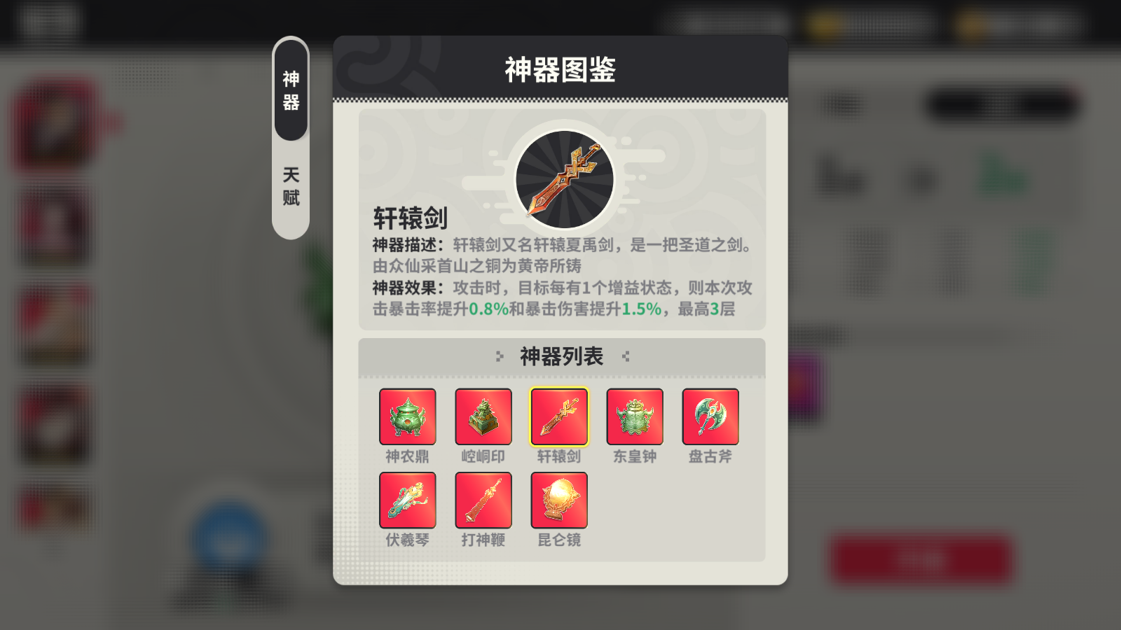 游戲內(nèi)有八個(gè)不同的神器,每個(gè)神器提供的效果都不一樣,主公可根據(jù)自身陣容選擇搭配,神器會(huì)佩戴天賦技能,可通過(guò)重鑄改變神器的天賦技能。