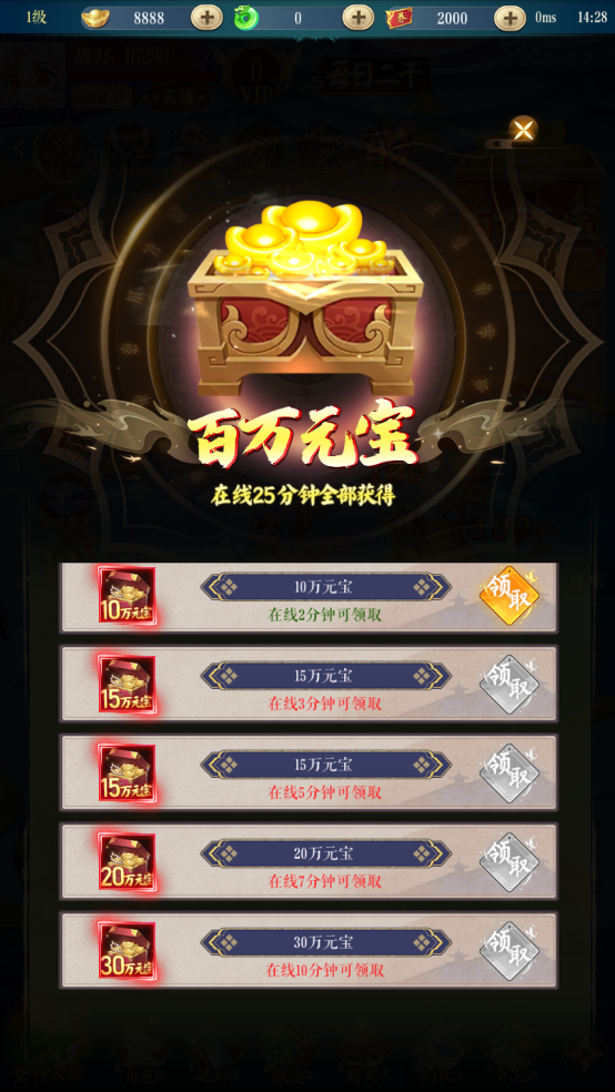 進入游戲后完成在線時長即可領(lǐng)取百萬元寶,無門檻開啟的