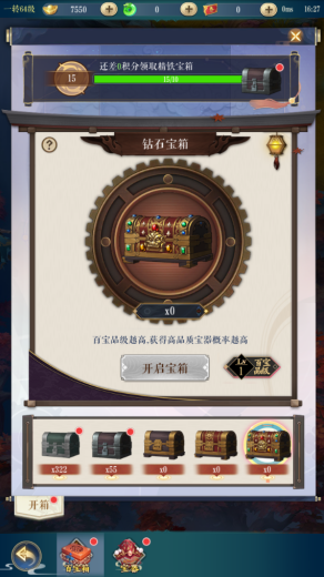 闖關(guān)可免費獲得寶箱,每個寶箱含有若干充值卡、珍稀道具、寶器