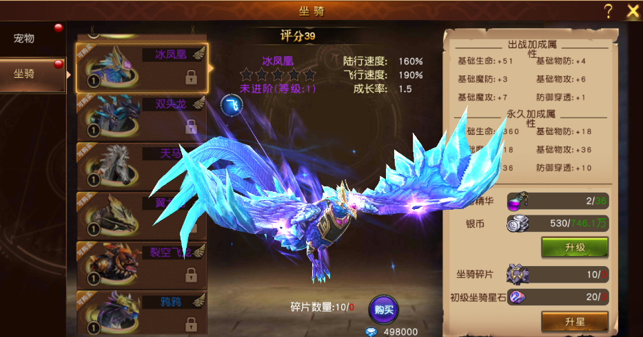 坐騎:每只坐騎都會(huì)為玩家?guī)?lái)生命、物防、魔防、物攻、攻、防御穿透的屬性提升,坐騎品質(zhì)越高,提升越大。玩家可通過(guò)坐騎的升級(jí)以及升星來(lái)提升坐騎的屬性。